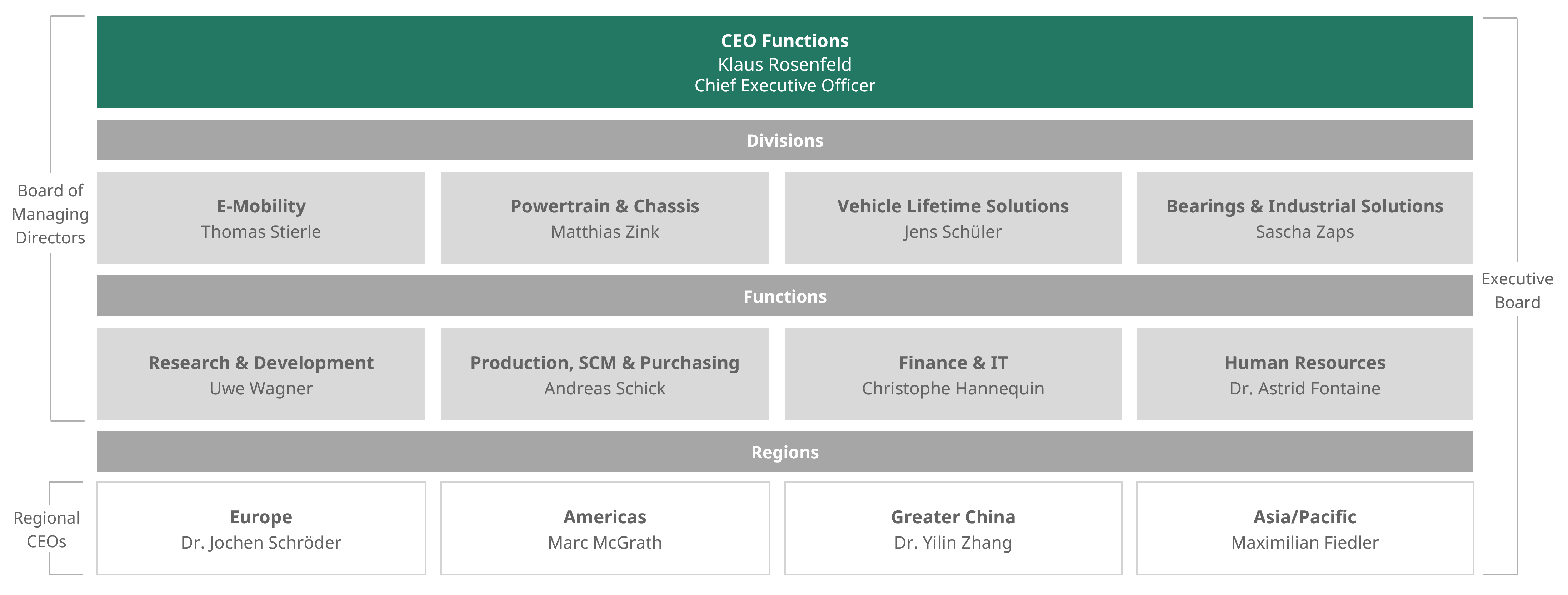The Schaeffler Group is characterized by a three-dimensional organizational and leadership structure which differentiates between divisions, functions, and regions.